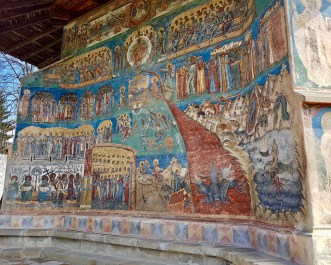 Desde Moldovita nos dirigimos hacia el norte, cruzamos el paso de montaña de Ciumarna, base de senderismo por los bosques de hayas y abetos que predominan en la región y donde hay un pequeño quiosco que vende bebidas y un curioso monumento con la forma de la palma de una mano. Tras el descenso, orientado al norte y muy cerca de la frontera con Ucrania, entramos en tierras del monasterio de Sucevita, situado en un bucólico entorno, cada vez más alpino. Su arquitectura mezcla, como en los demás, el arte gótico con el bizantino y es uno de los ocho con pinturas murales exteriores sobre el Viejo y el Nuevo Testamento, a los que se añaden escenas de la vida cotidiana en el siglo XVI.
