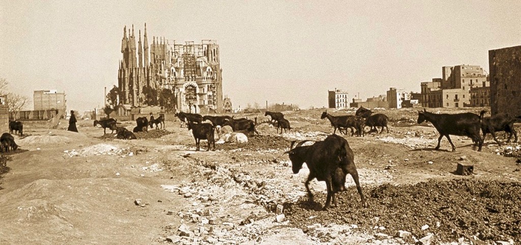 Pasado y futuro de la Sagrada Familia, durante la construcción y después de la destrucción. Imagen de César Comas Llabería / Arxiu Comas